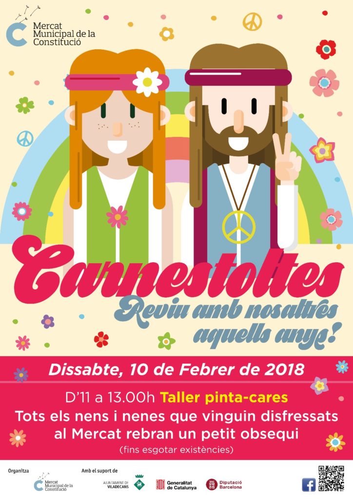 Carnestoltes Hippie al Mercat! 2 marzo, 202029 enero, 2018 por Lidia Piñol Dissabte 10 de febrer Carnestoltes al Mercat! Vine d’11h a 13h a pintar-te la cara! Tots els nens i nenes que vinguin disfressats s’emportaran un petit obsequi! No hi faltis!!!